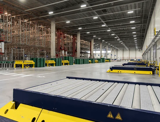 Modular roller conveyors transport inhouse pallets reliably within ASRS. Designed for speed, scalability and seamless software integration.