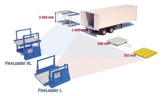 FlexLoader L lifts up to 1,600 mm. FlexLoader XL reaches 3,050 mm and supports an optional operator cabin for high-altitude control.
